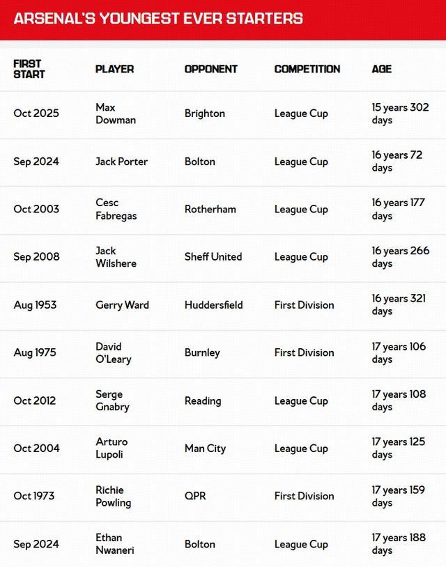 英联杯第3轮,阿森纳主场2-0击败布莱顿晋级。本场比赛,阿森纳15岁小将道曼首发出战71分钟。至此,道曼以15岁302天的年龄成为阿森纳队史最年轻的首发球员。